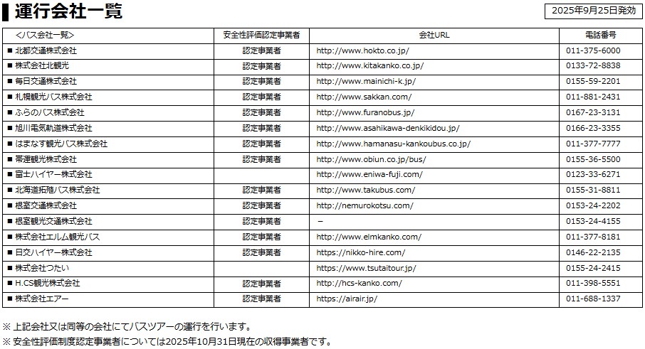 運行バス会社は確定次第ご連絡致します。運行予定のバス会社は下記運行バス会社一覧よりご確認ください。