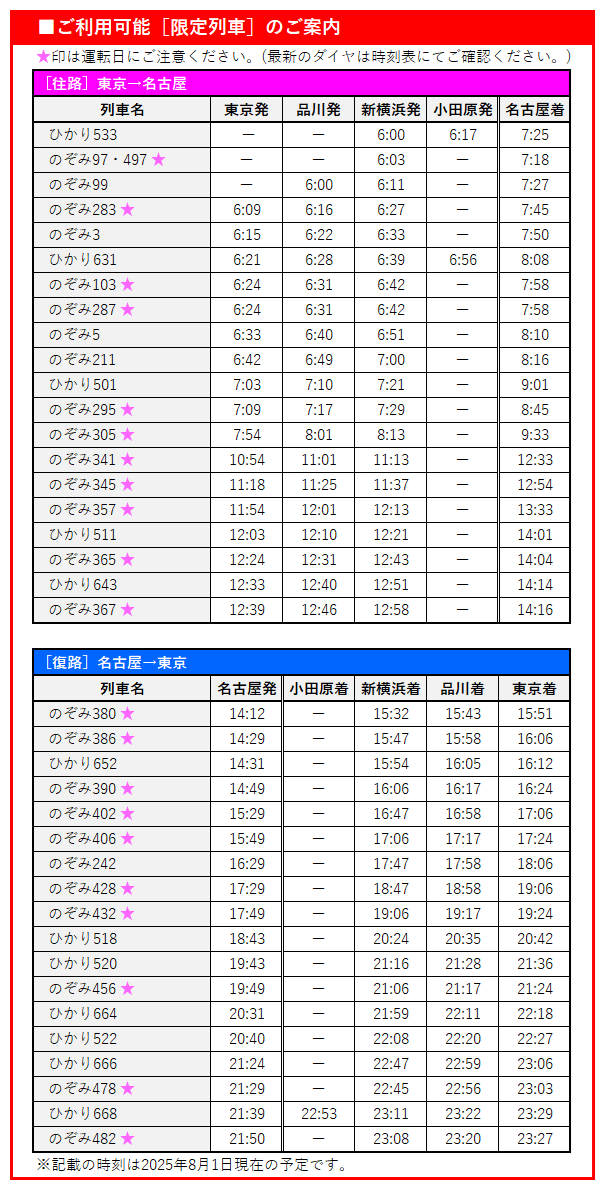 ※小田原駅をご利用の場合は「限定列車ひかり号」利用限定となります。