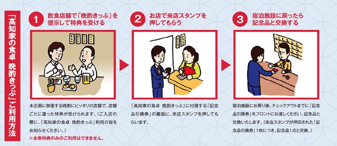 高知家の人たちとふれあい、高知の素晴らしい「食」との出合いを楽しんで、さらにサービスや特典、記念品をゲットしてください。