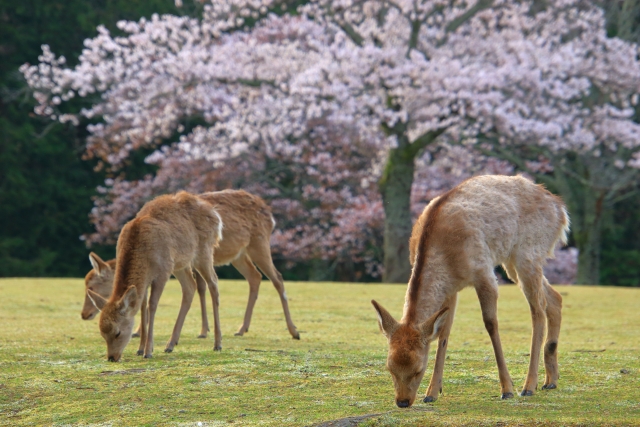 【奈良の桜 イメージ】奈良公園の鹿と桜のイメージ(※桜の時期:例年3月下旬~4月上旬、天候状況等により異なる場合がございます)
