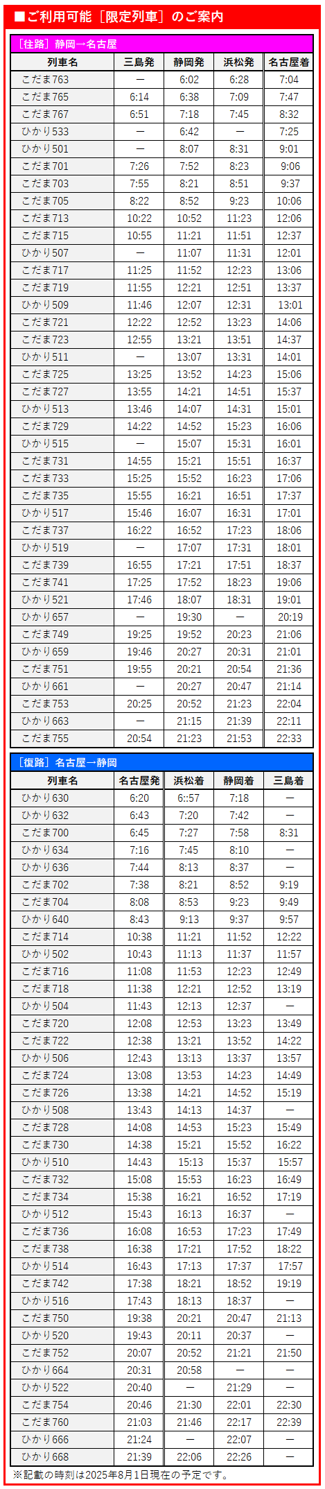 ●往復の東海道新幹線「限定列車ひかり」「限定列車こだま」普通車指定席〔静岡駅⇔名古屋駅〕
