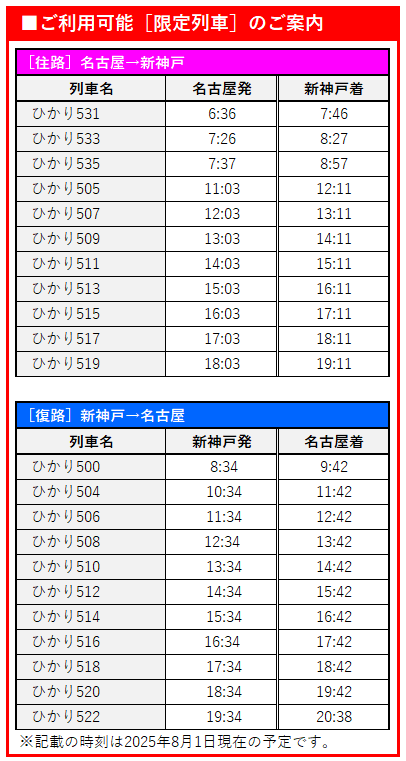 ●往復の東海道新幹線「限定ひかり号」普通車指定席〔名古屋駅⇔新神戸駅〕