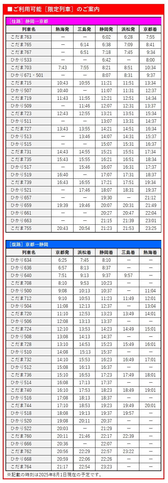 ●往復の東海道新幹線「限定列車こだま」「限定列車ひかり」普通車指定席〔静岡駅⇔京都駅〕