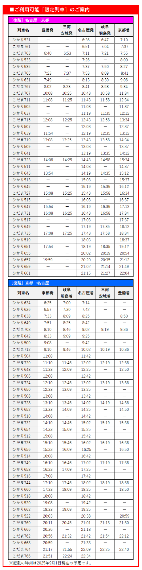 - ●往復の東海道新幹線「限定列車ひかり」または「限定列車こだま」(普通車指定席/名古屋駅⇔京都駅)