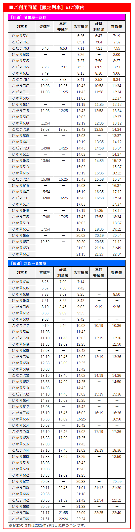 ●往復の東海道新幹線「限定列車ひかり」「限定列車こだま」普通車指定席〔名古屋駅⇔京都駅〕