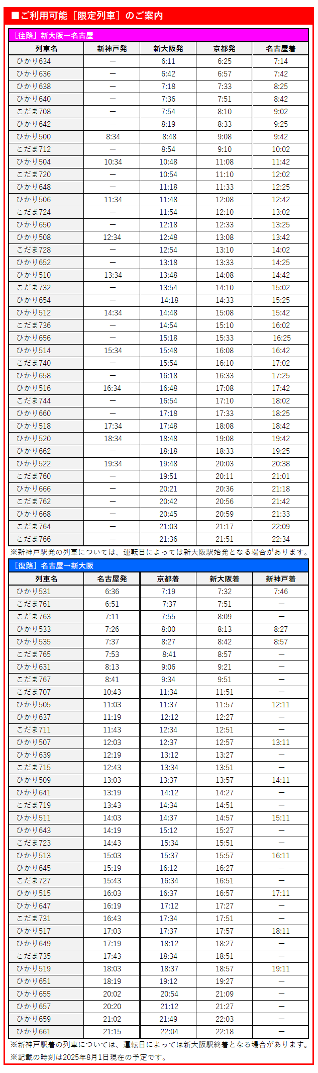 ●往復の東海道新幹線「限定列車ひかり」「限定列車こだま」普通車指定席〔新大阪駅⇔名古屋駅〕
