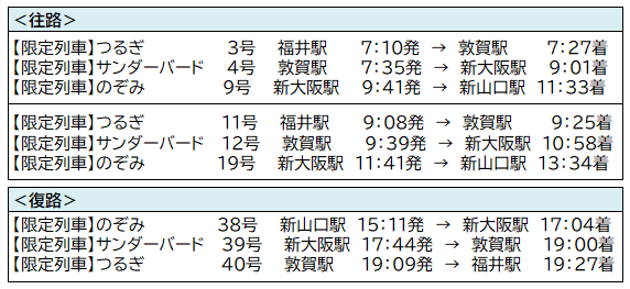 ※新幹線・特急指定席区間(各新幹線乗車駅⇔新山口駅)・乗車券区間(福井駅⇔新山口駅)