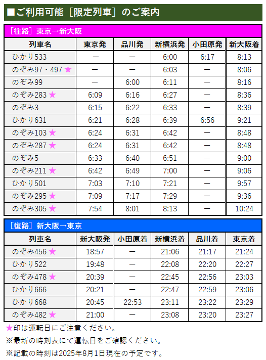 - ※乗車券は東京都区内(または横浜市内)~大阪市内までの乗車券となります。